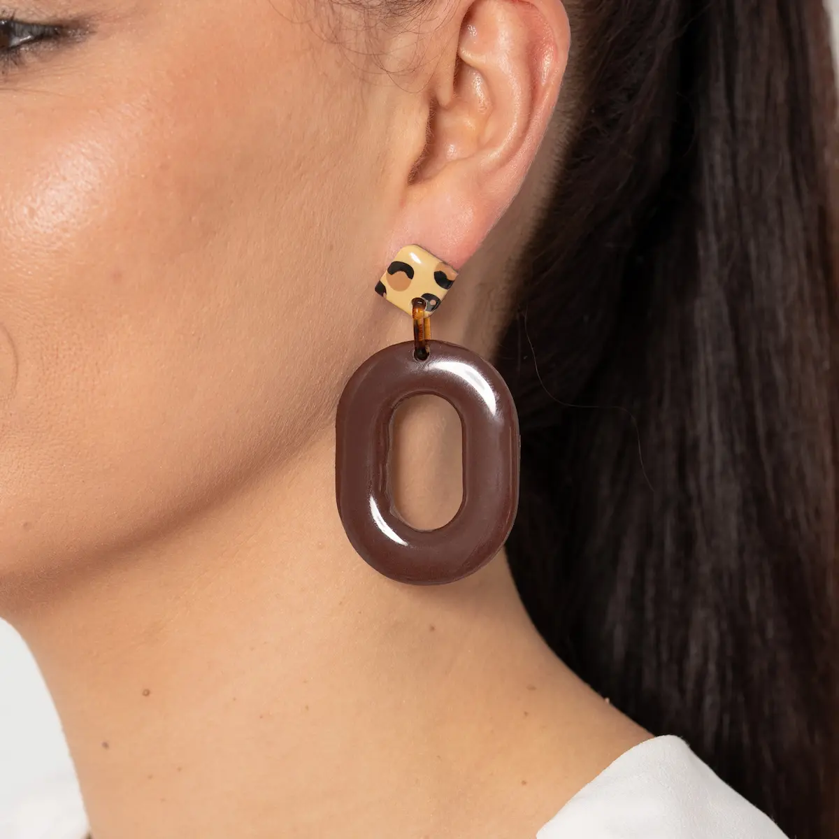 • Pendientes artesanales Leopardo Style 2.0, en plata de ley 925 y arcilla polimérica. Un rombo en color marrón chocolate pegado al lóbulo con una pieza colgante con estampado de leopardo. Ligeros y exclusivos.