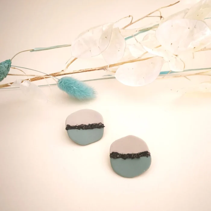 • Pendientes artesanales vintage verde mini de plata de ley y arcilla polimérica. Pegados al lóbulo en tonos arena, negro y verde.