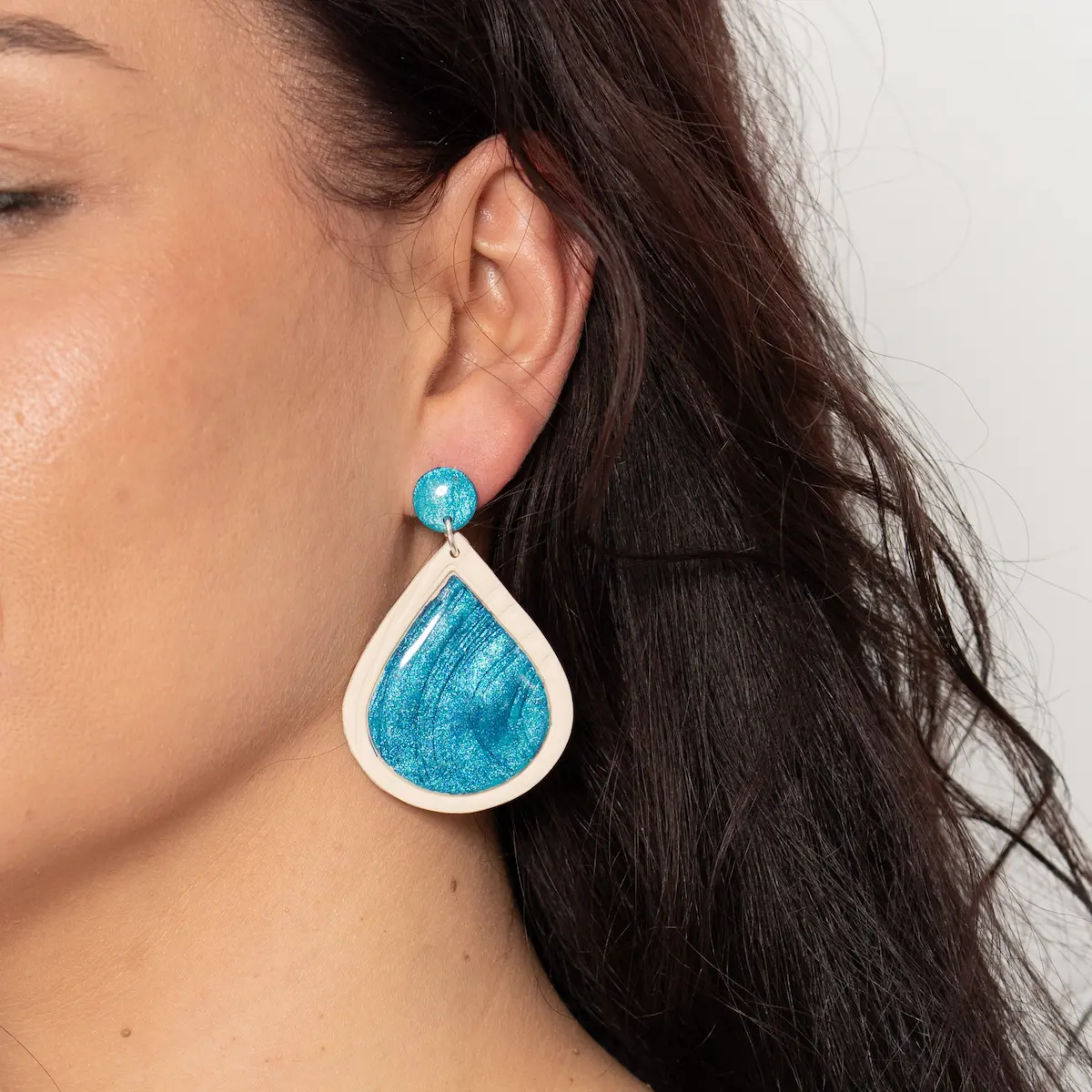 Pendientes en forma gota, piezas que con su llamativo color reflejan la valentía y la fuerza que se esconde detrás de una lágrima. Confeccionados y pintados a mano con mucho amor. Una base neutra con un contraste metalizado para atraer todas las miradas. ¿Turquesa o rosa? Tú eliges.